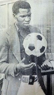 ![]() Mwape soon after the Zambian squad arrived in Lusaka from the African Cup of Nations finals in March 1974 | |||