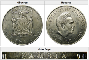 Another design feature of the coin is a lettered edge that has the phrase “ONE ZAMBIA ONE NATION * 24.10.1964 * “.